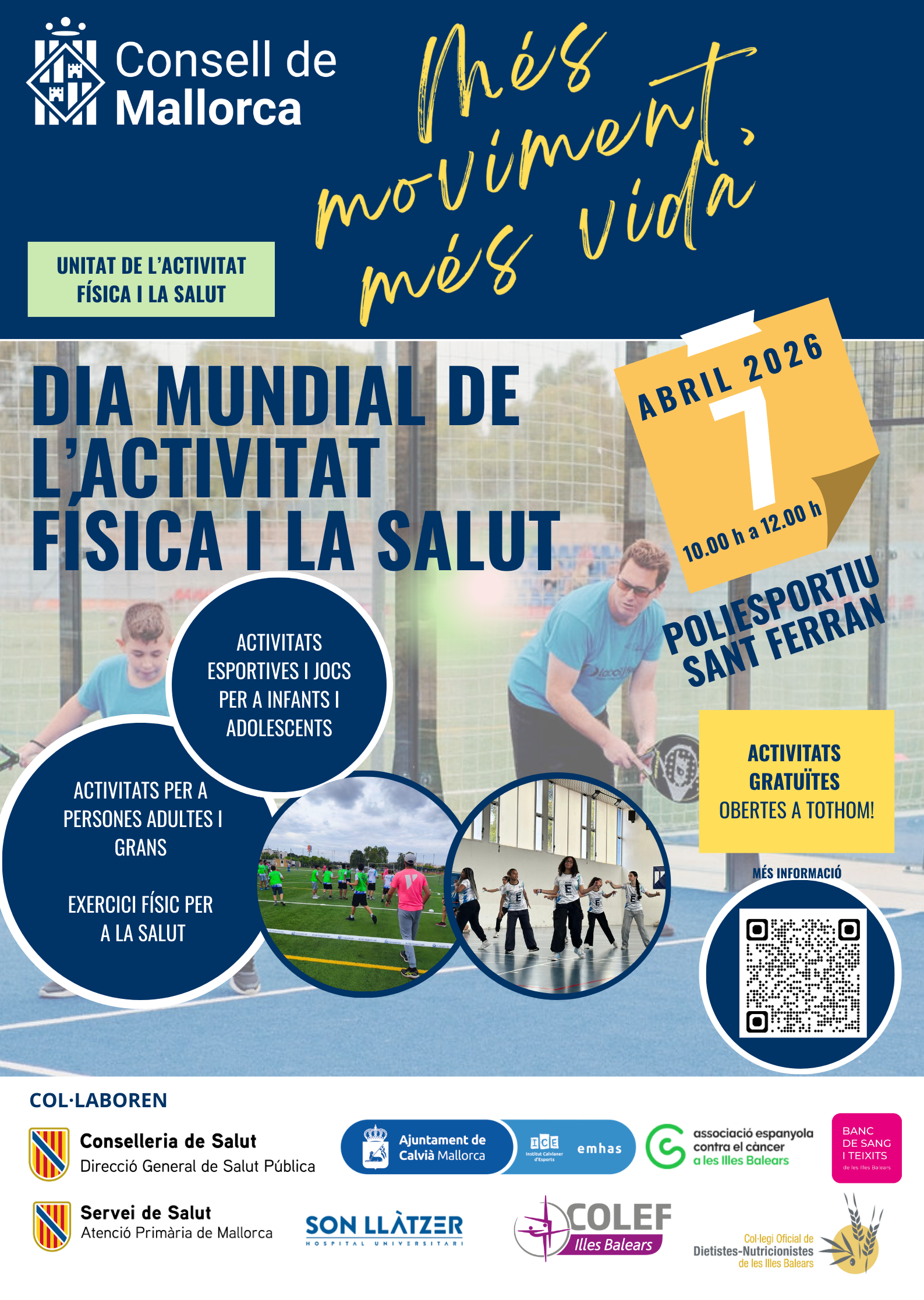 El Consell de Mallorca organitza la Diada del Dia Mundial de l’Activitat Física i la Salut, una jornada adreçada a persones de totes les edats amb l’objectiu de fomentar hàbits saludables, impulsar la pràctica regular d’activitat física i enfortir la relació entre les entitats i la comunitat.
